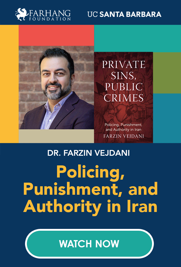 A compelling lecture by Dr. Farzin Vejdani titled “Policing, Punishment, and Authority in Iran”, presented by Farhang Foundation in partnership with the Iranian Studies Initiative at UC Santa Barbara.